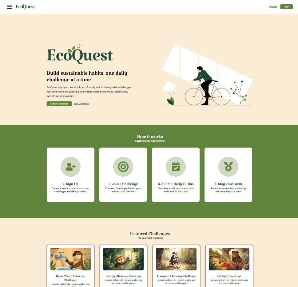 Da uns HTML und CSS bereits größtenteils vertraut waren, konnten wir direkt mit React und Vite in die Entwicklung einsteigen und haben dabei über Git kooperiert. Nach der API-Integration konnten wir die Daten aus der MongoDB anzeigen lassen, Challenges filtern, User anlegen und diese einloggen und an Challenges teilnehmen lassen und vieles mehr. Die unterschiedlichen Seiten, Menüs und Modale haben wir nach den Figma-Vorlagen gebaut und mit Animationen und ansprechendem Feedback für die User gestaltet. EcoQuest ist dabei komplett responsiv gestaltet.