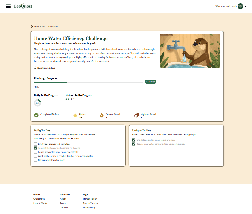 In EcoQuest können sich User ein persönliches Konto anlegen und sich für eine oder mehrere spannende Challenges eintragen. Eine Challenge geht ca. zwei Wochen. In diesem Zeitraum können über abgeschlossene To Dos Punkte gesammelt werden.