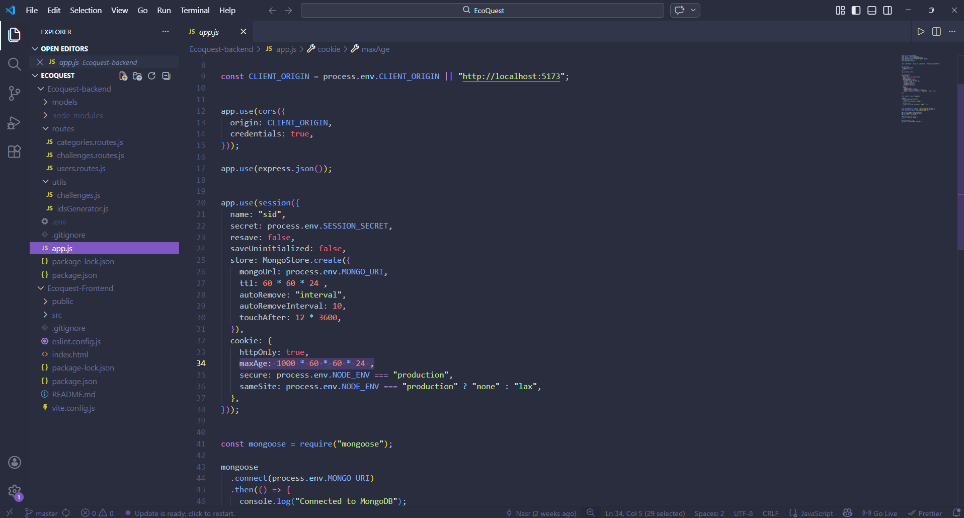 Dabei hatten wir 2 Backend-Entwickler, die die technische Grundlage von EcoQuest implementiert haben. Hierfür haben wir eine REST-API mit Node.js und Express umgesetzt, über die das Frontend mit der Datenbank kommunizieren kann. Die Datenhaltung erfolgte über MongoDB, wodurch Benutzer, Challenges und Fortschrittsdaten flexibel in einer dokumentenbasierten Struktur gespeichert werden konnten. Zusätzlich wurde ein Session-Management implementiert, das die Registrierung, Anmeldung und Authentifizierung von Nutzer:innen ermöglicht und geschützte API-Endpunkte absichert.