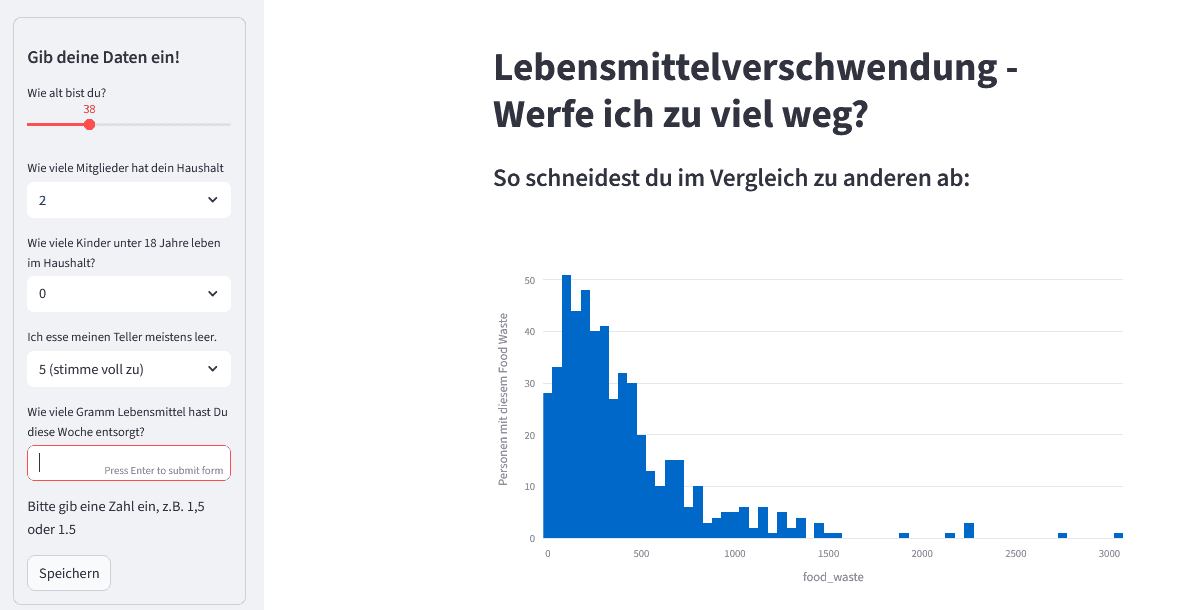 Im Hauptbereich der App werden die Ergebnisse der Analysen mittels statistischer und visueller Funktionen (Plotly, Numpy, SciPy, Statsmodels) dargestellt. Als erste Informationen sollten die User dort eine grafische Darstellung des Datensatzes erhalten, in die ihre persönliche Menge an weggeworfenen Lebensmitteln eingeordnet wird. Für eine genauere Einordnung wurde mittels statistischer Funktion ermittelt, wie groß der Anteil an Personen im Datensatz ist, die ebenso viel wegwerfen, wie die User.